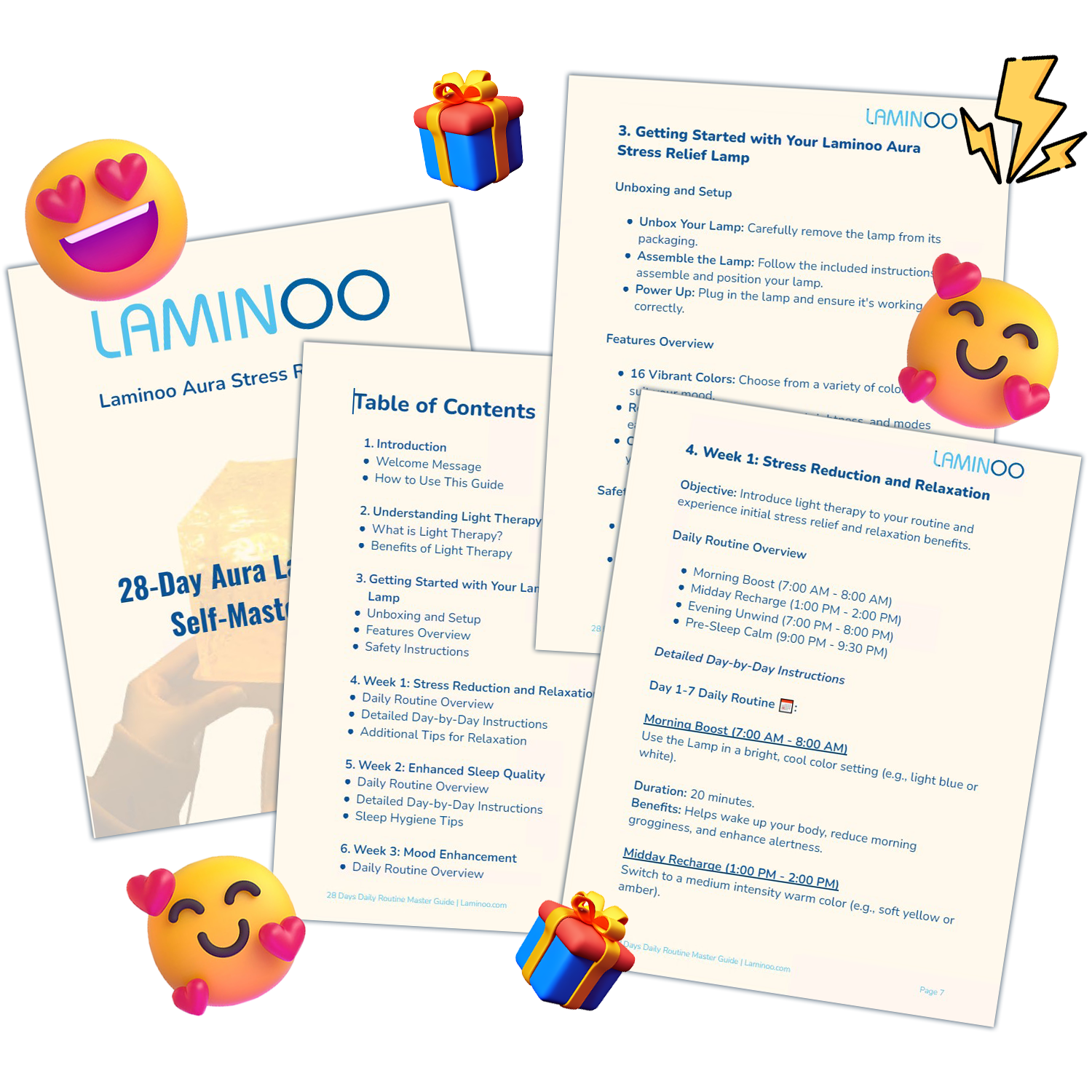 The 28 Days Challenge Routine Master Guide is a step-by-step routine designed to help you integrate the Laminoo Aura Lamp into your daily life. It includes tips and exercises to enhance your relaxation and stress relief over 28 days.